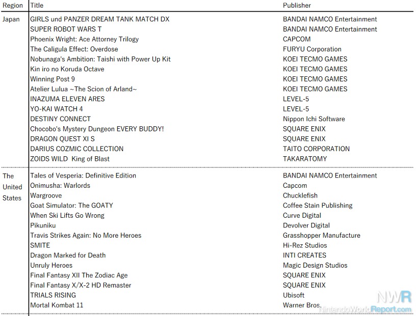 The announcement of the reboot of Metroid Prime 4 did not cause any change in its release status; it is still listed as TBA though the announcement was made after the end of the quarter. Fire Emblem: Three Houses is still listed as spring, and no further release information was given for 1st party titles. The full upcoming slates are in the gallery attached to this article.