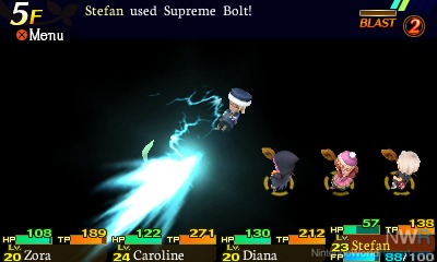 Mystery Dungeon’s contribution to this game comes most prominently in dungeon exploration, which has largely been revamped from the Etrian style to feel more interactive than the old turn-based staple. 3D chibi character sprites are controlled from a top-down perspective and move around each randomized floor of a dungeon, encountering enemies and loot as they continue. Players will always control only one character in the party, although the leader can be swapped at any time with a single click, while the rest of the party is controlled by AI. Fortunately these AIs are mostly intelligent in their choice of skills and attack and are usually more helpful than hindering when they are not locked on to a fleeing monster like a dog after a squirrel or spamming skills and squeezing their TP for all its worth. Control freaks might have problems with this system and find themselves constantly flipping between leaders in an attempt to balance their members as much as possible. The game attempts to alleviate the issue some by allowing an automatic switch to an AI when there is a crucial decision to be made, such as which enemy to target when multiple are in range or whether to heal someone whose health has fallen dangerously low. This system cuts down on wasted time in simple enemy battles, but can be extremely stressful when players pop into a horde of six or seven enemies. Boss fights do thankfully change however, allowing for full control of each character’s action like a more traditional RPG.